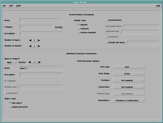 To begin a Module Builder session, enter: dx -builder. The dialog box (Figure 4) consists of a menu bar and two major sections: